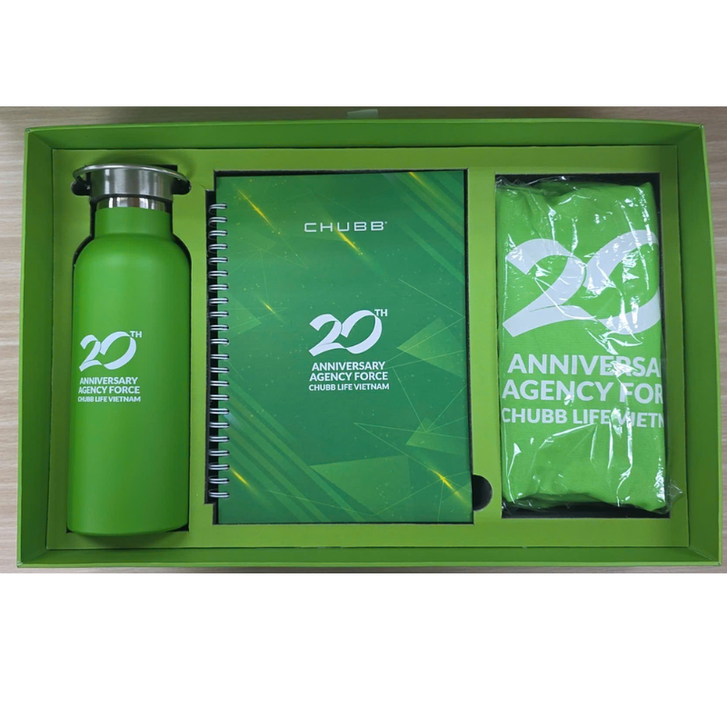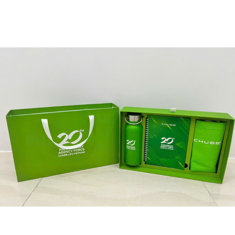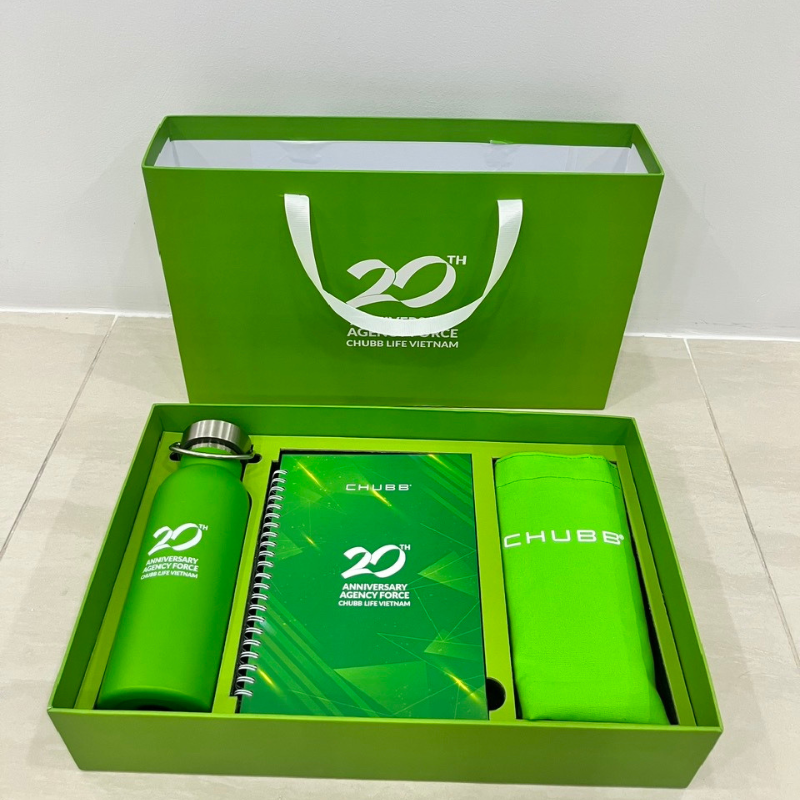 Dưới đây là 1 số hình ảnh bộ sản phẩm QUÀ TẶNG NHÂN VIÊN VÀ TRI ÂN KHÁCH HÀNG mà chúng tôi đã hoàn thành cho sự kiện sinh nhật 20 năm của  CÔNG TY TNHH BẢO HIỂM NHÂN THỌ CHUBB VIỆT NAM  được thiết kế mang màu sắc riêng đi theo concept tone màu xanh tăng trưởng chủ đạo của Chubb Life và truyền tải thông điệp ấn tượng đánh dấu hành trình 20 năm thành lập -tăng trưởng và phát triển tại Việt Nam. Sản phẩm bao gồm: